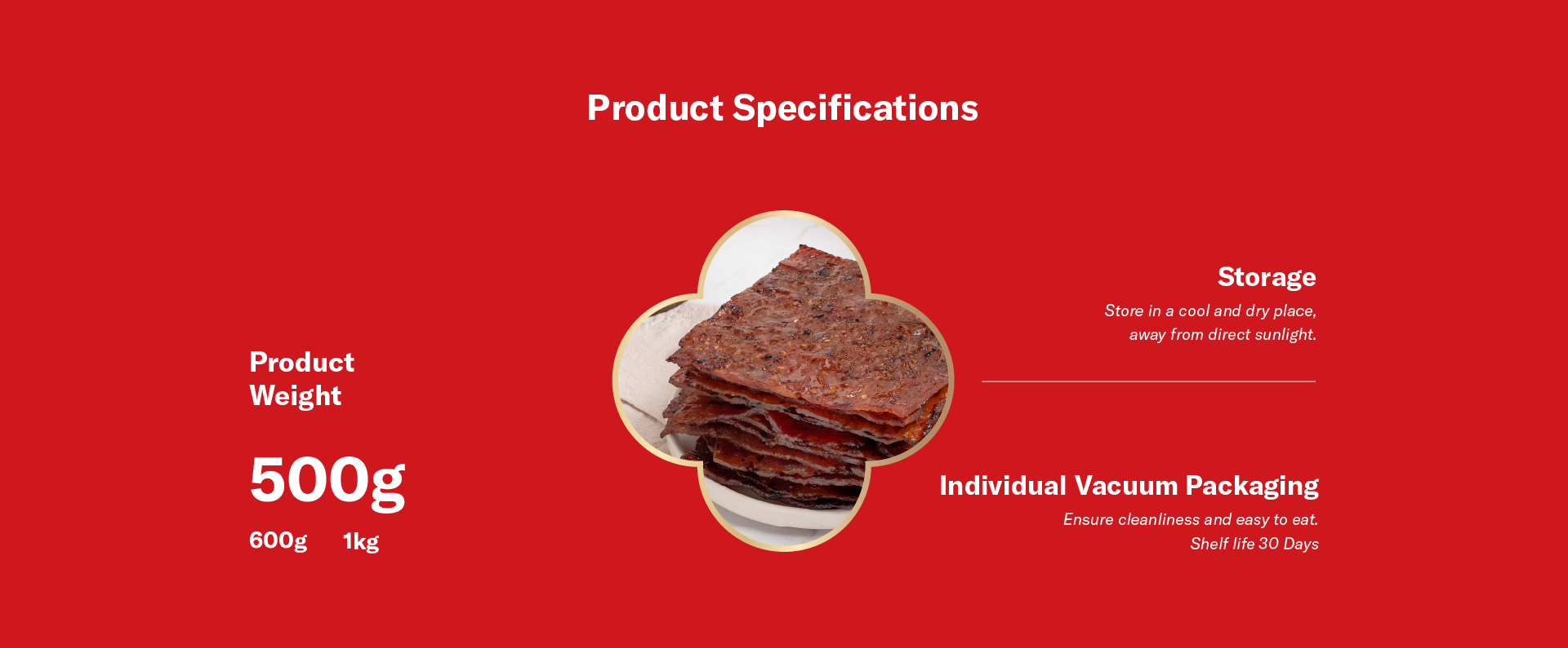 Lean meat, Sugar, Fish sauce, Cooking oil, Smoke flavouring, Chili flakes, Garlic powder, Monosodium glutamate, White pepper powder, Spices, Sodium erythorbate (E316) as permitted antioxidant, Potassium sorbate (E202) as permitted preservatives, and Polydextrose (E1200).