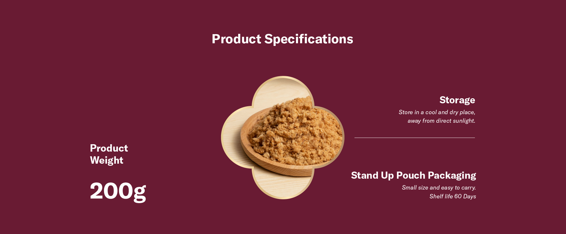 Pork (250g per 100g Crispy Pork Floss), Sugar, Soy Sauce, Cooking Oil (Palm, Peanut and Sesame), Salt, Margarine, White Pepper Powder, Flavour Enhancer (INS 621) and Flavour Subtance.