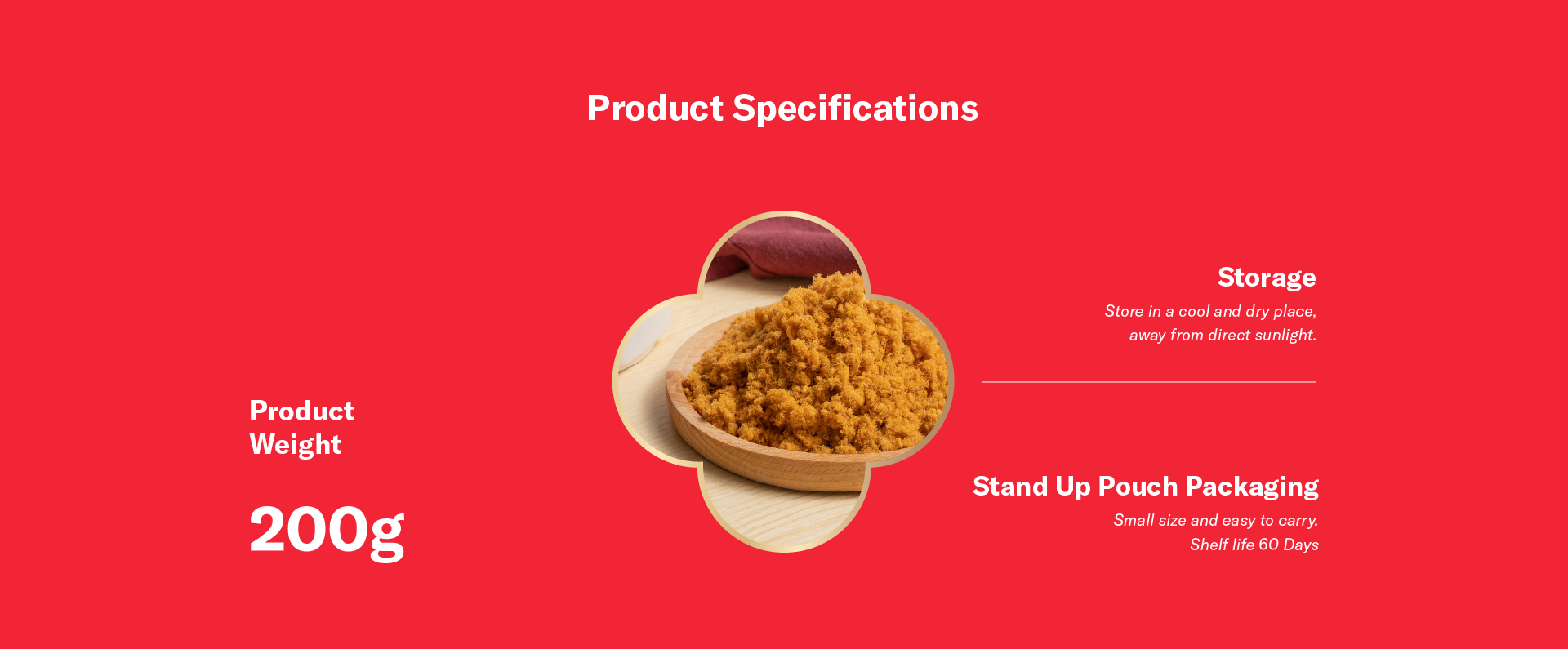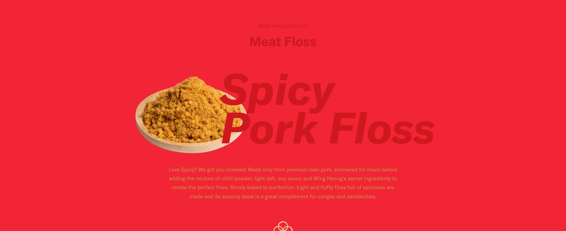 Pork (250 g per 100 g Spicy Crispy Pork Floss), Sugar, Soy Sauce, Cooking Oil (Palm, Peanut and Sesame), Chili Powder, Salt, Margarine, White Pepper Powder, Flavour Enhancer (INS 621) and Flavour Subtance.